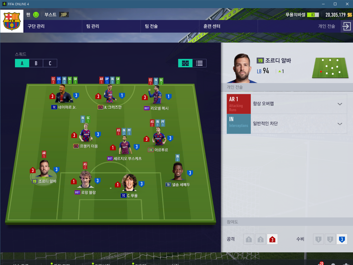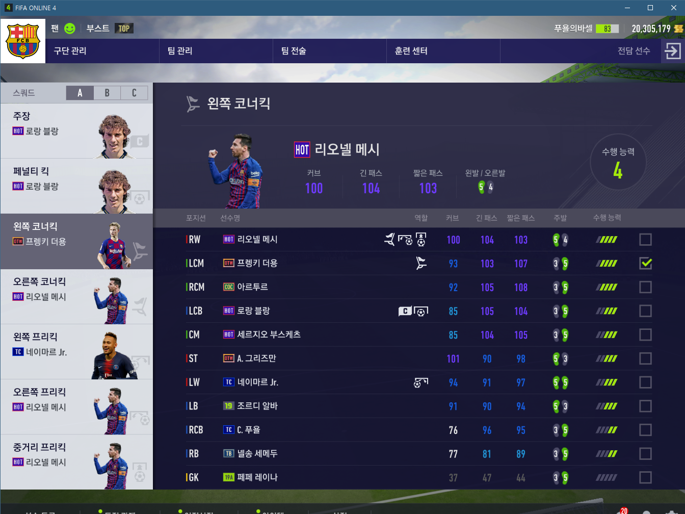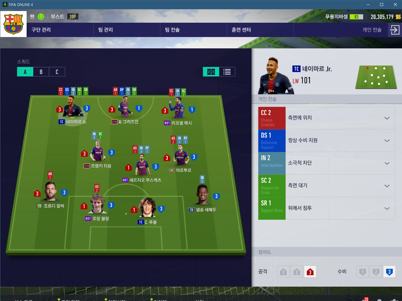 체력이 상당히 많이 드는데 어쩔수 없습니다... 네이마르와 크로스체인지되는 모습을 많이 보여주는데 심리전에 유용합니다. 그리고 역시 수비시에 부스케츠와 같이 신경을 써줘야하는 선수입니다.