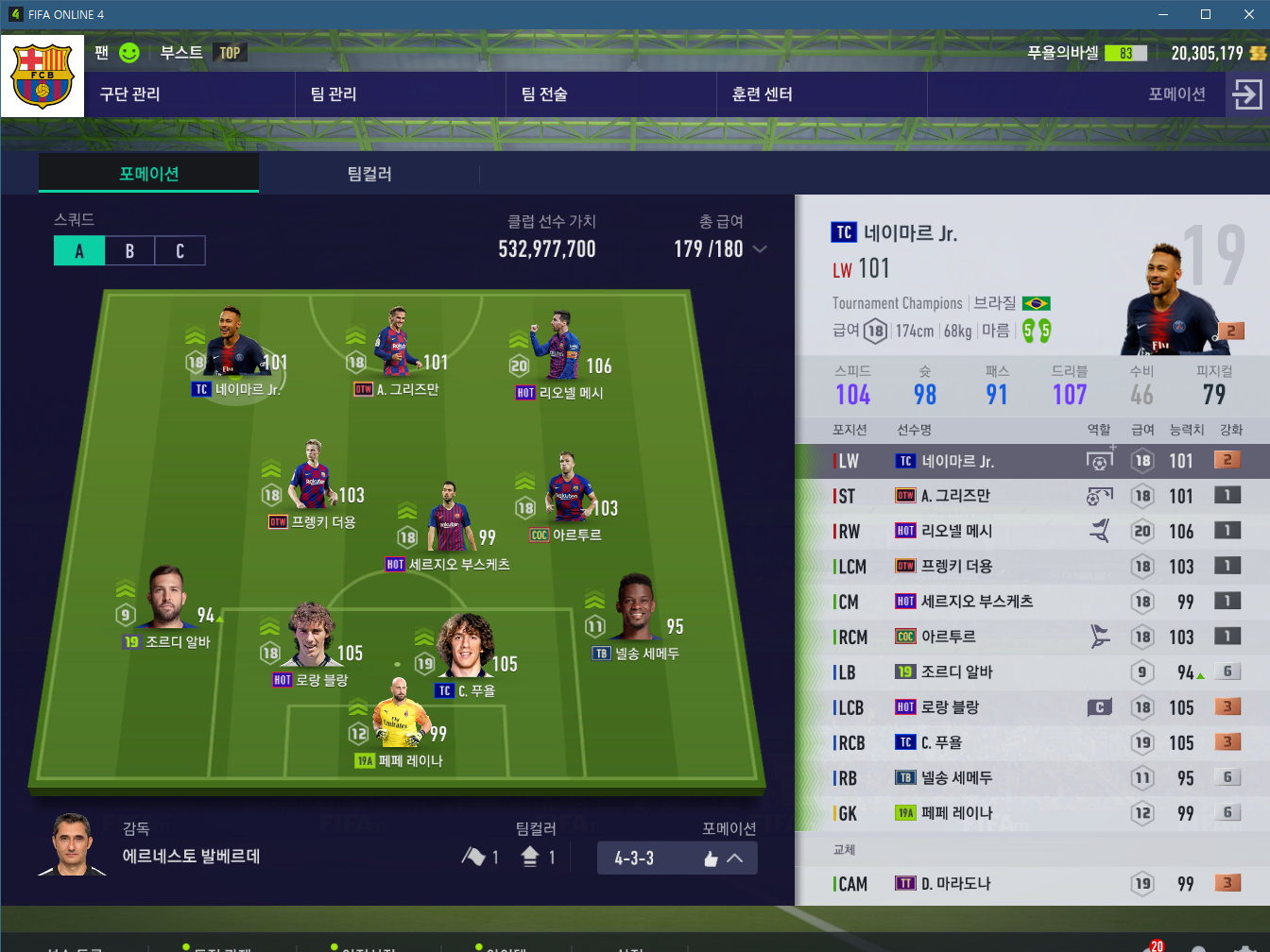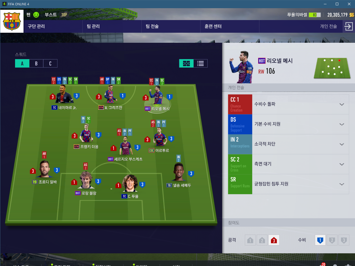보시면 4-3-3입니다. 부스케츠를 보통 cdm에 두시고 많이들 쓰시는데, 저는 감독 효과를 무시하지 않습니다. CM에서 가장 내리고, 그리고 부스케츠는 커서로 직접 잡고 수비포지션에 위치시키는 것이 더 좋은것 같습니다.